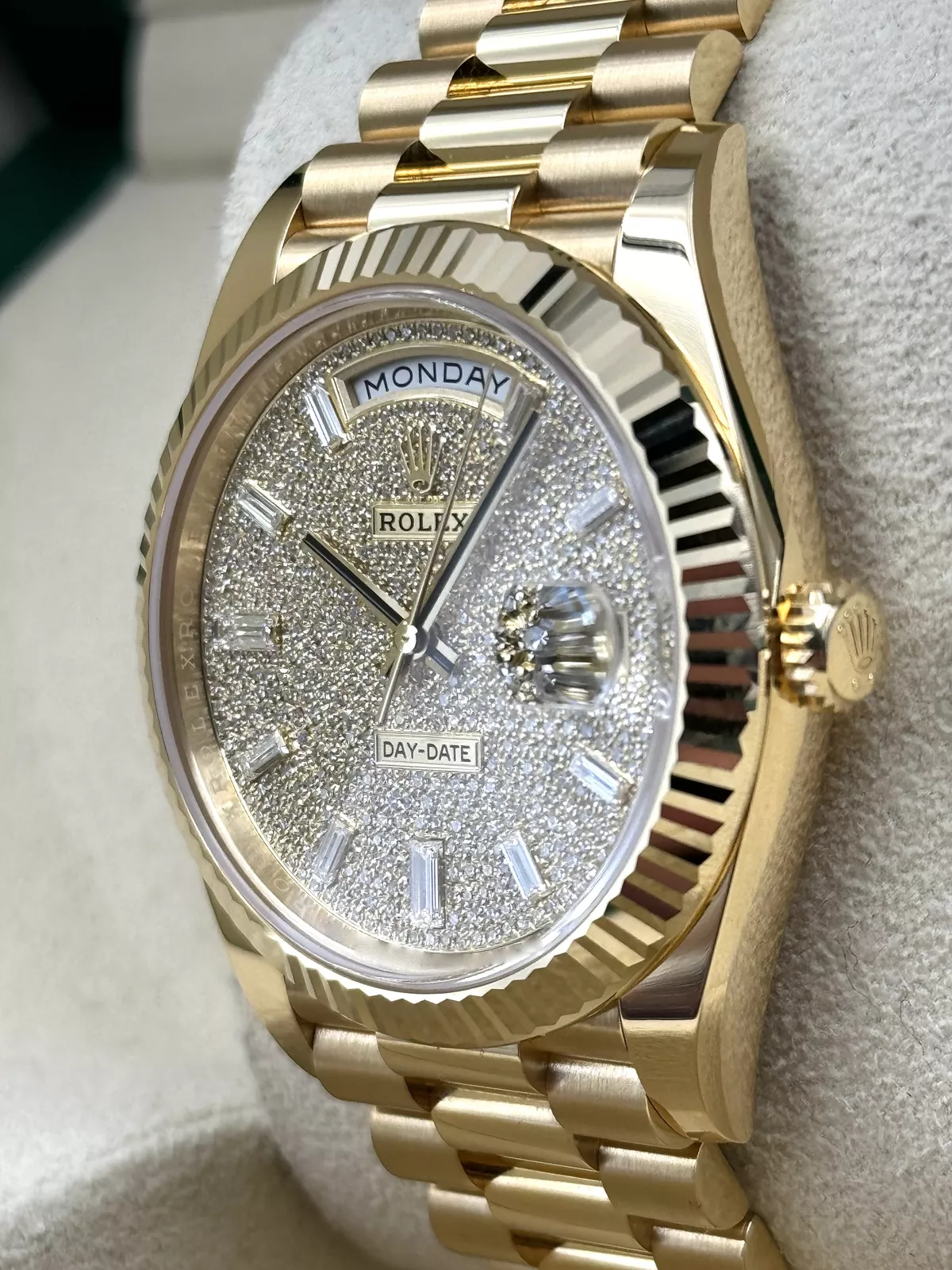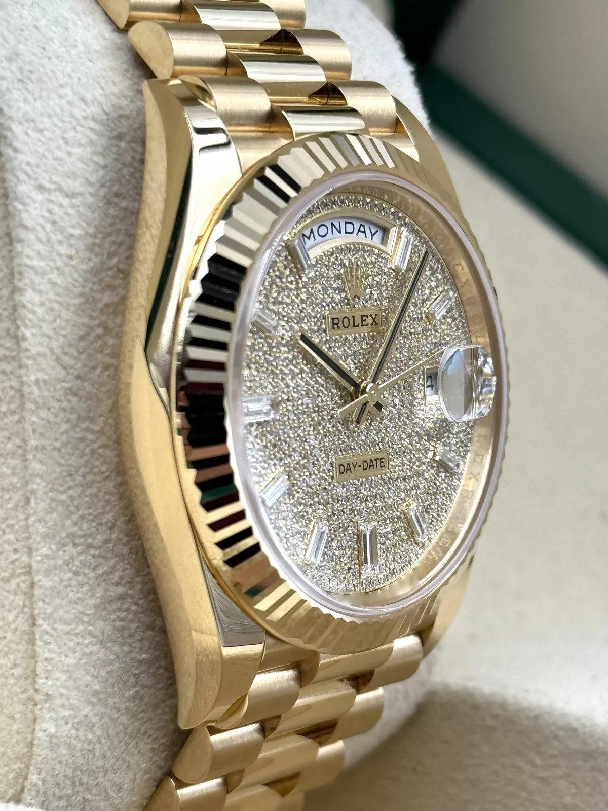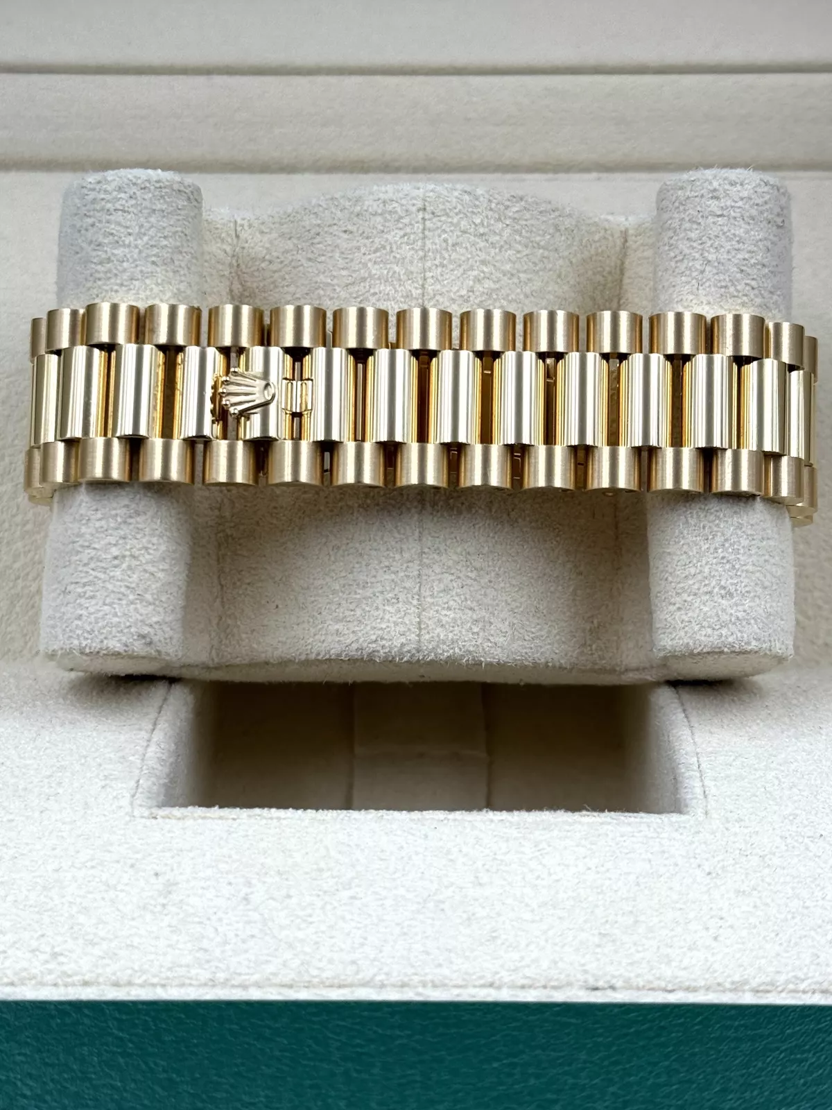 The watch is paired with the President bracelet, crafted from 18k yellow gold and featuring semi-circular three-piece links for ultimate comfort and elegance. The concealed Crownclasp adds a seamless and sophisticated finish, reflecting Rolex’s attention to detail.