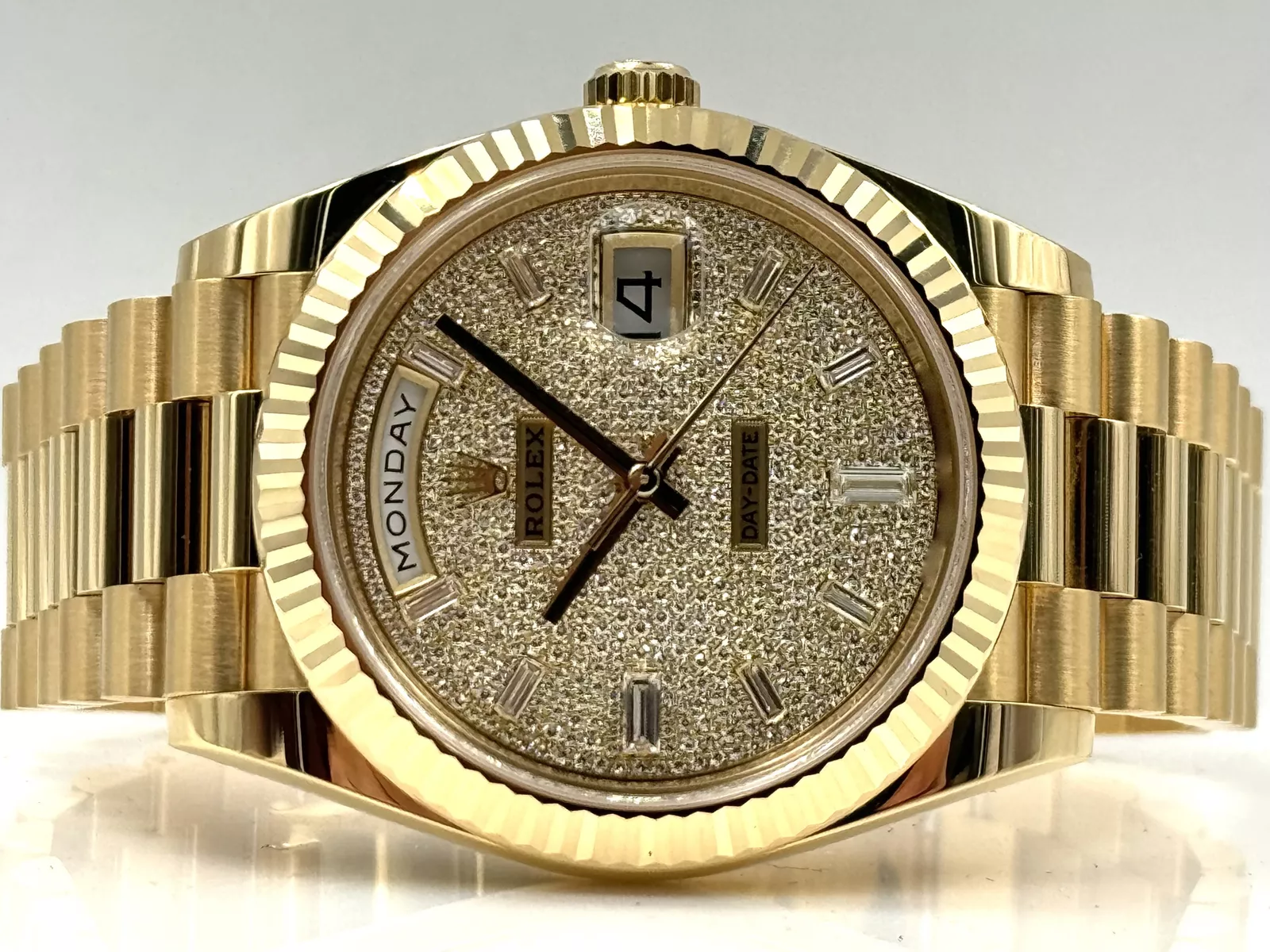 The pavé diamond dial is a dazzling masterpiece, featuring meticulously set diamonds that shimmer with every movement. Applied Roman numeral hour markers in 18k yellow gold add a classic touch, while the matching yellow gold hands ensure legibility amidst the brilliance. The iconic day display at 12 o’clock and the date window at 3 o’clock, magnified by Rolex’s Cyclops lens, enhance the watch’s functionality without detracting from its opulent design.