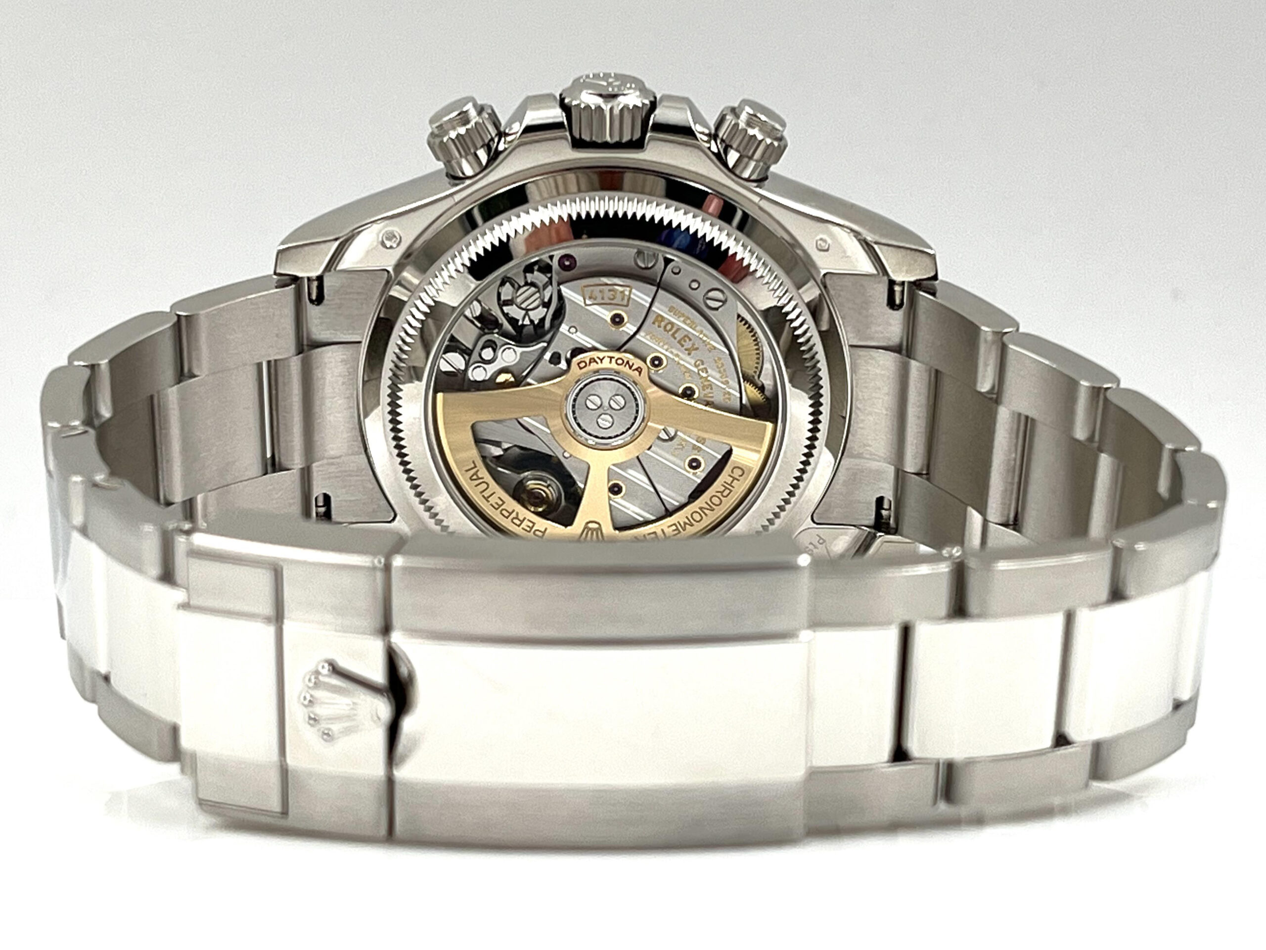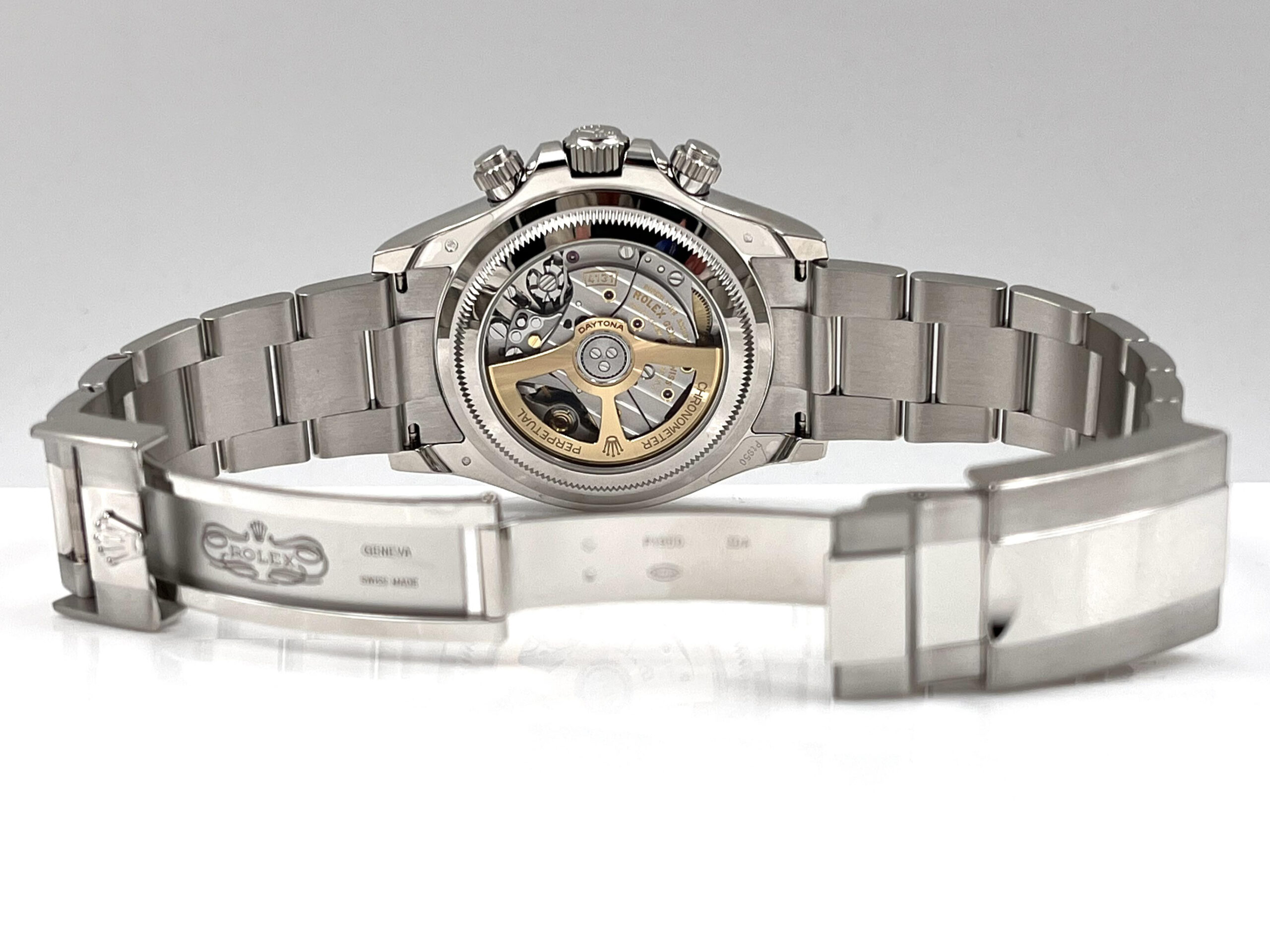 This watch is 100% Unworn and comes with the Original Box, Booklets, Green Chronometer Tag, and Warranty Card. The watch does not come with the bezel protector nor the white serial tag. The warranty card was dated and all of the stickers were removed from the watch at the time of the original purchase from the Rolex Authorized Dealer. The bracelet may have been sized at the time of the original purchase but the watch comes with all links that come standard on Rolex Daytona models.