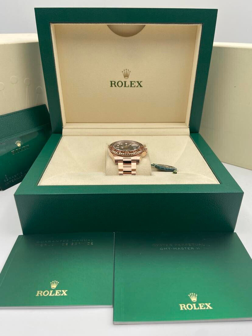 Introducing the Rolex GMT Master II 126715CHNR (Year: 2024) – a testament to timeless design and precision. This piece features a black dial, rose gold bracelet, and 40 mm rose gold case, making it a statement piece that effortlessly captures attention.