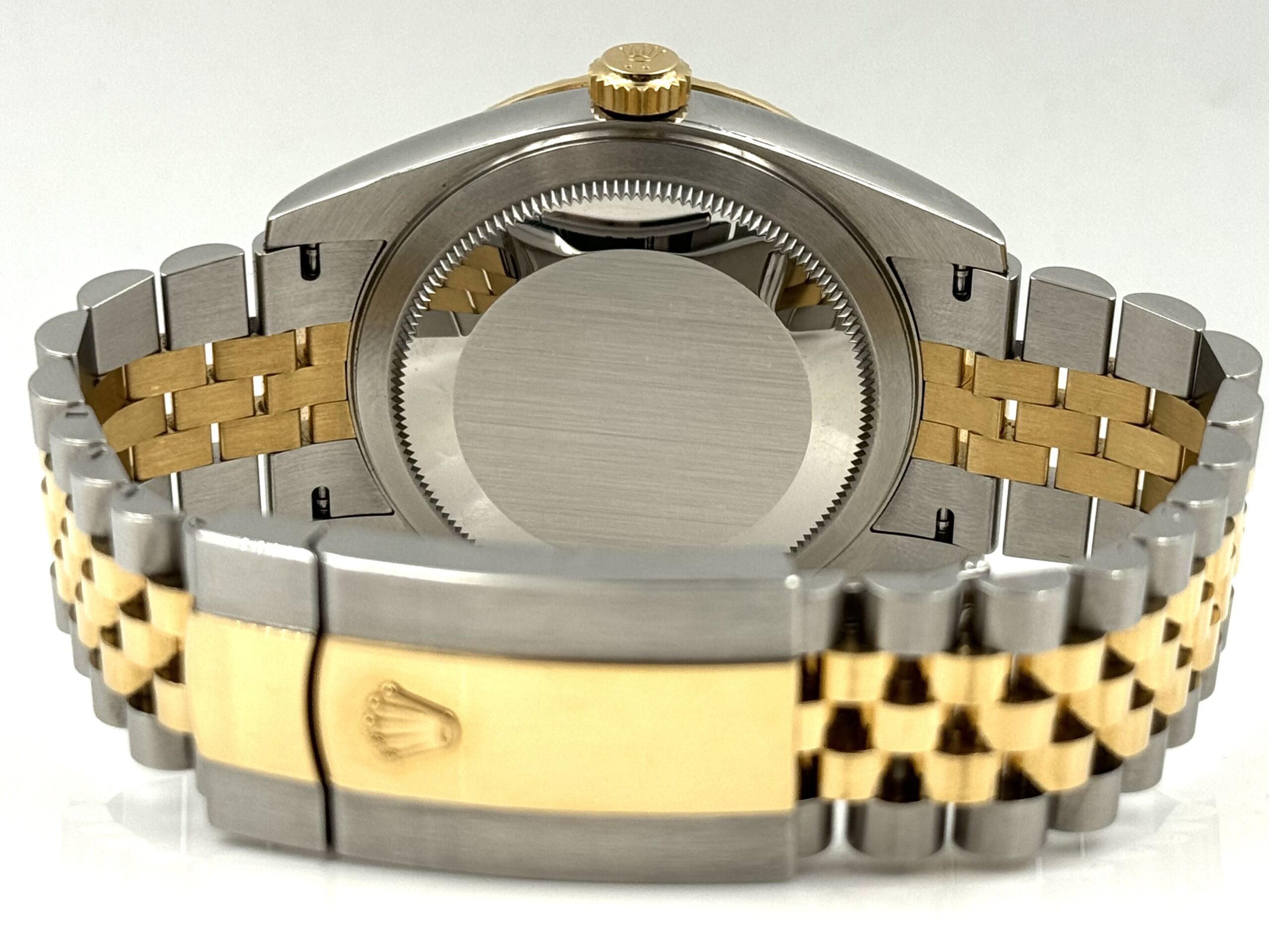 The Jubilee bracelet on this Sky-Dweller (Ref. 336933) elevates the watch’s elegance. This five-link bracelet, crafted from a combination of stainless steel and 18k yellow gold, offers a comfortable and supple fit on the wrist. The polished center links complement the overall luxurious aesthetic, while the concealed clasp ensures a seamless look.