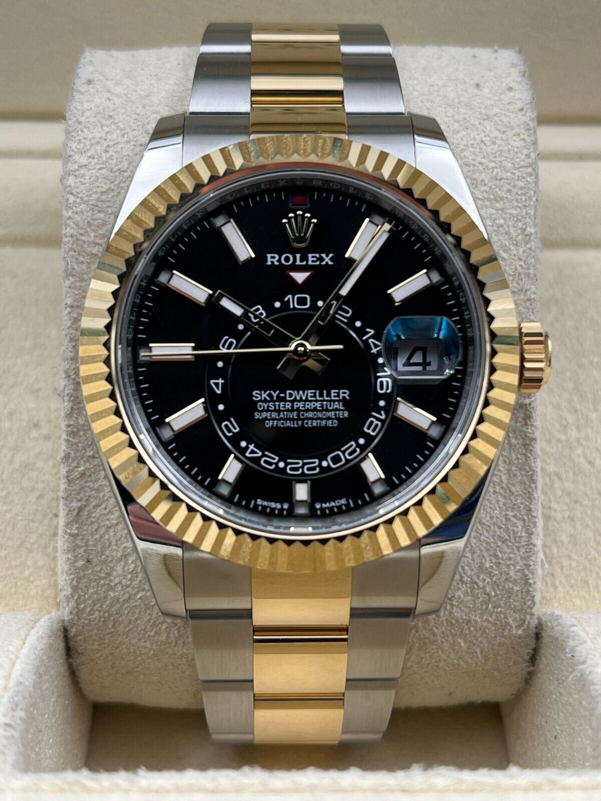 Introducing the Rolex Sky-Dweller 336933 (Year: 2023) – a testament to timeless design and precision. This piece features a black dial, two tone yellow gold/stainless steel bracelet, and 42 mm steel case, making it a statement piece that effortlessly captures attention.