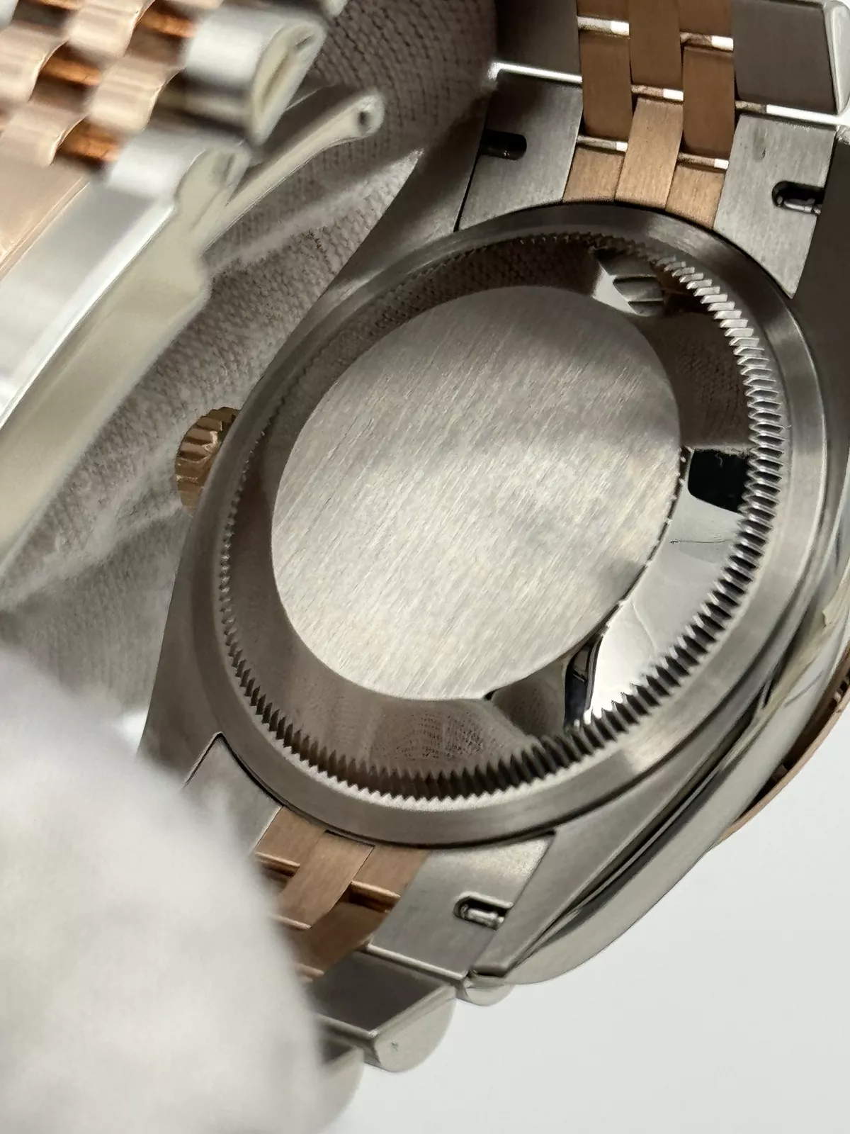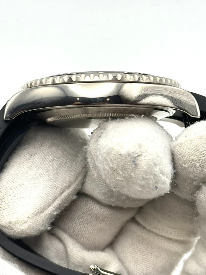 There are some light marks on the case, case back, and clasp from wear. None of the marks are deep in nature. The crystal appears to be free from any major imperfections warranting replacement. The bezel has a scratch that can be seen in the first photo of the listing.